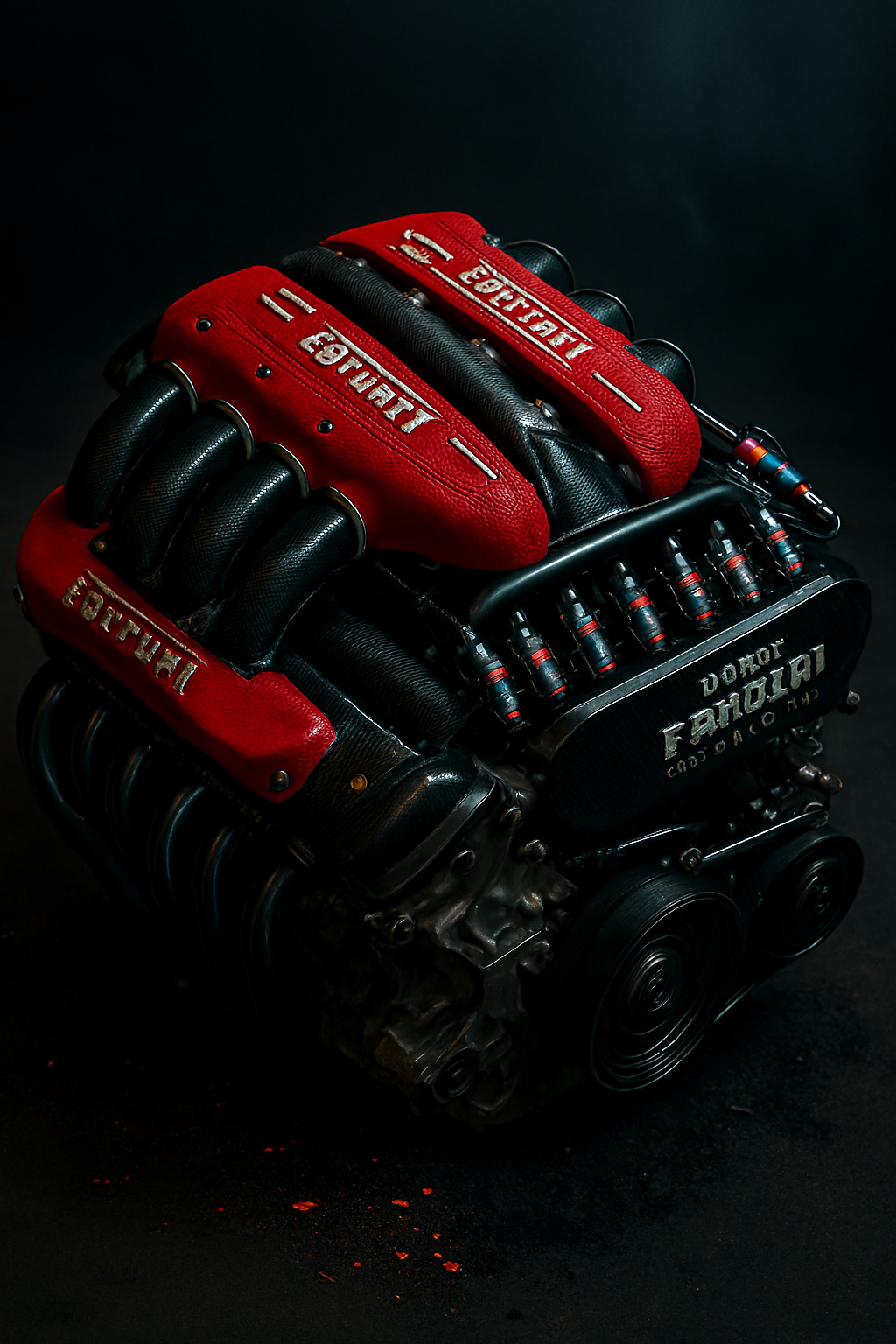 Engine Block: Jet black with red accents, engraved with the Ferrari prancing horse and the House of Geronimo seal