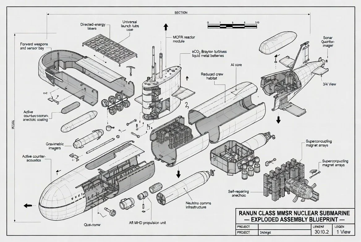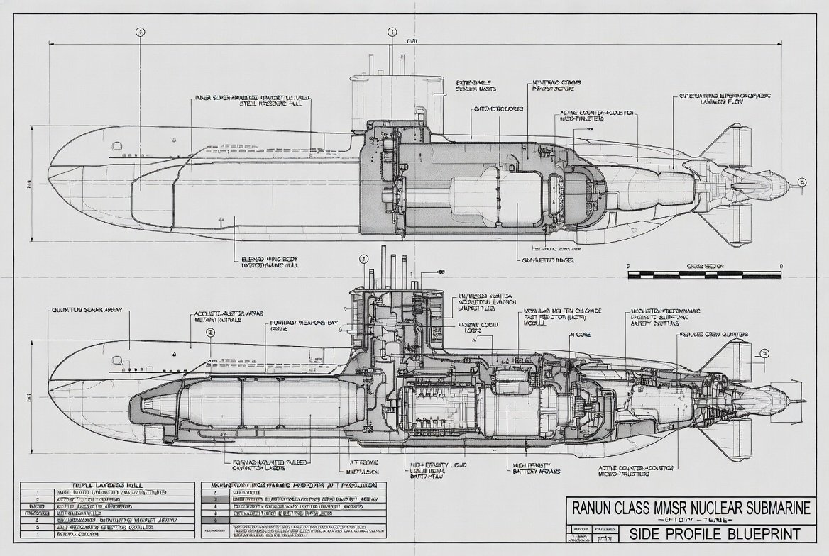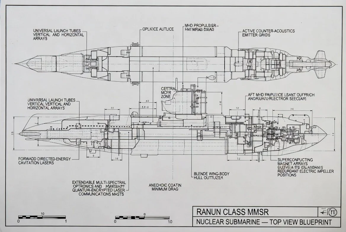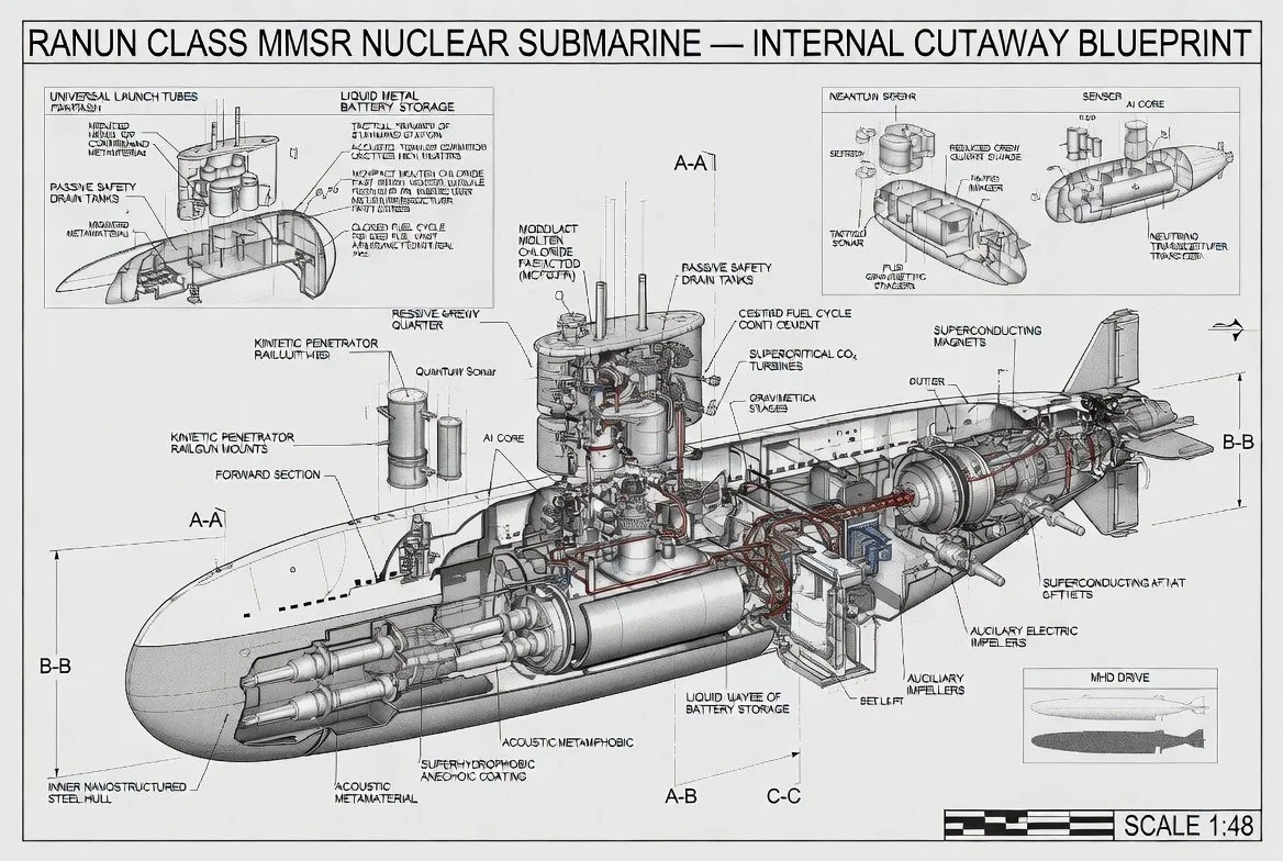 Overview: The Ranun-class isn't just a submarine; it's a self-contained, virtually omniscient, and utterly devastating platform designed for indefinite, undetected operations. Its core is an advanced Modular Molten Chloride Fast Reactor (MCFR), providing unprecedented power density and inherent safety. This vessel redefines stealth, speed, and strategic reach.
